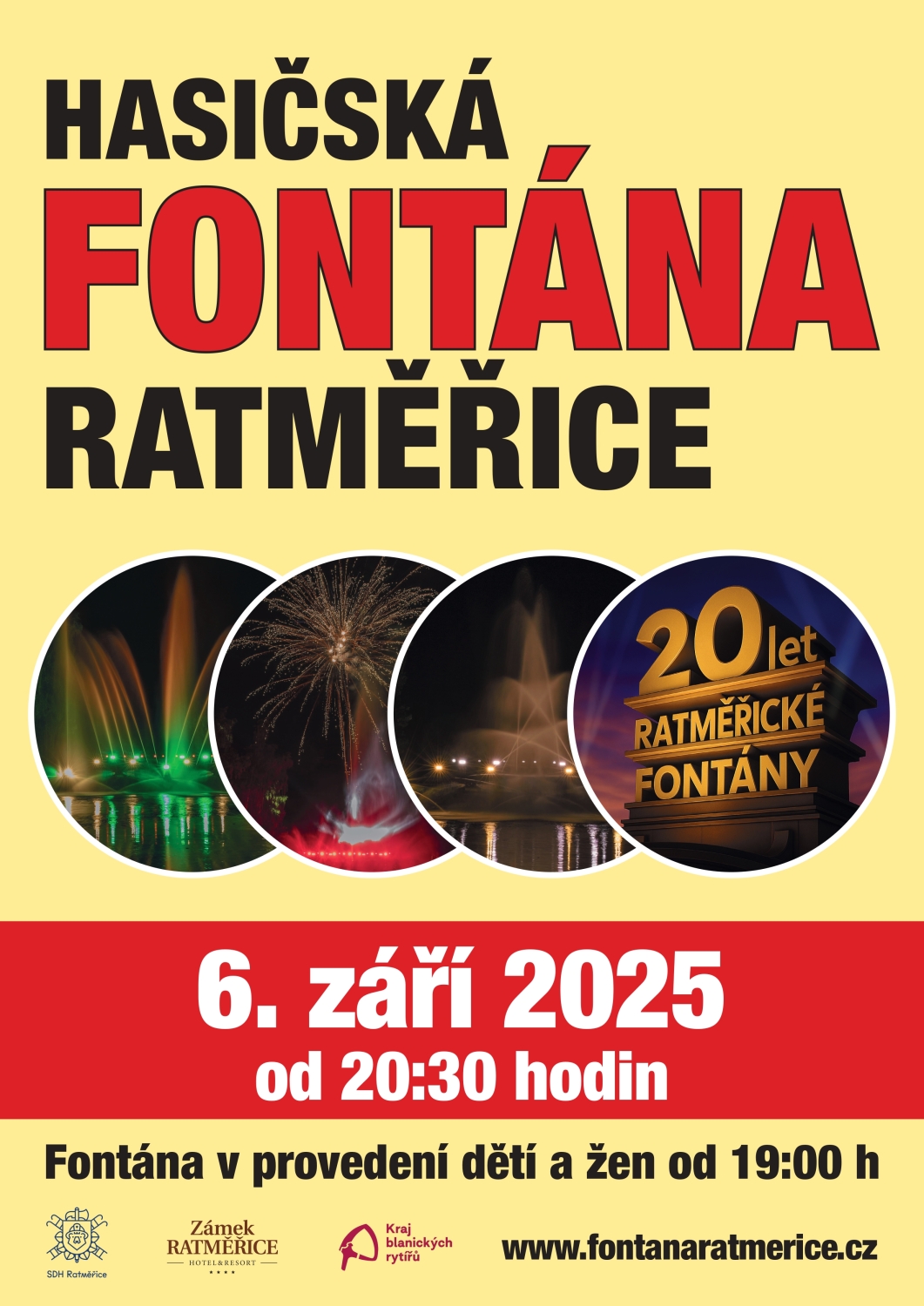 Přijďte se podívat na světelnou vodní poezii, která spojuje jedinečné obrazce osvětlených kapek vody s hudebními čísly velikánů klasické hudby, ale i rockových hvězd nebo syntezátorových mágů. Originální představení v režii Sboru dobrovolných hasičů Ratměřice začíná v 19:00 fontánou v provedení dětí a žen a pokračuje hlavním vystoupením od 20:30, kterému bude předcházet živé klavírní vystoupení.